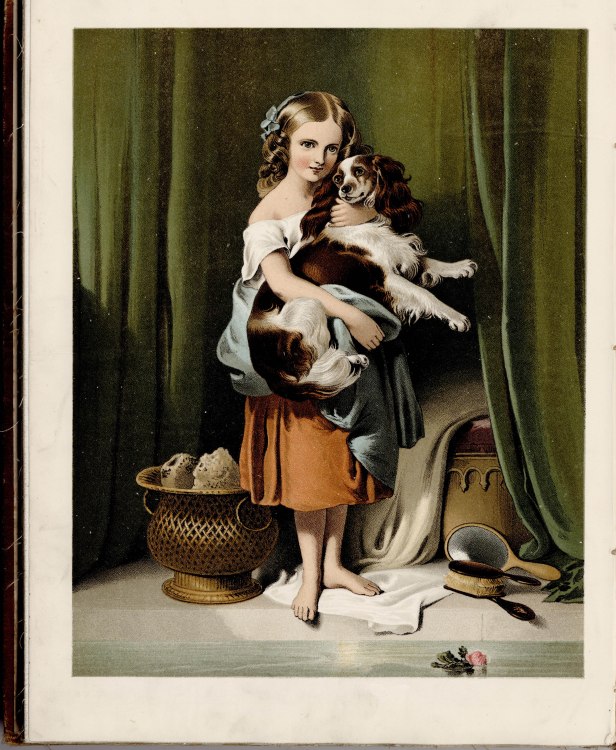 Here is a nice image called Beauty’s bath, by Sir Edwin Henry Landseer in 1847. A girl holding her dog (cute), commonly mistaken to be Queen Victoria and Dash (her favourite dog, BTW) but is actually Miss Eliza Peel with dog, Fido. Enjoy.