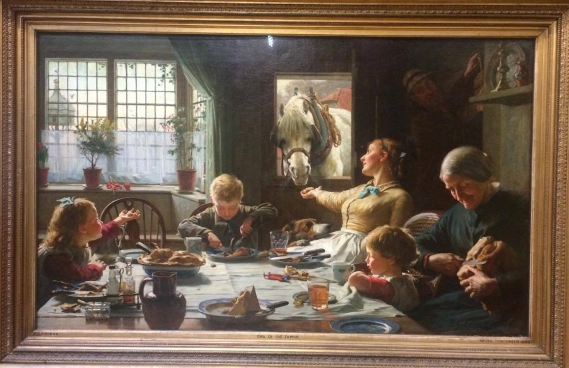 To further our knowledge of Victorian art, we visited the Walker Art Gallery on Thursday morning. The gallery really is a special place. There are many artists from, or with connections to, Liverpool; adding again to the charm and cultural essence of this amazing city. We began our visit in the sculpture gallery where there was one 19th century sculpture in particular to gain our attention; ‘The Goat Herd’ (1839) by Emil Wolff. The work is of a young woman holding a kid goat whilst feeding the adult goat at her feet. Within moments of arriving at the gallery, the Victorians’ affinity with animals was expressed. Jade and I both agreed on ‘One of The Family’ as the loveliest Victorian animal painting in the gallery. It is by Frederic George Cotman and dated 1880. I love the warmth and naturalness of the scene. The lighting reminds me of a cold winter afternoon when there are no clouds but the sun is weak. Here is a photo of the painting that Jade took on her phone: