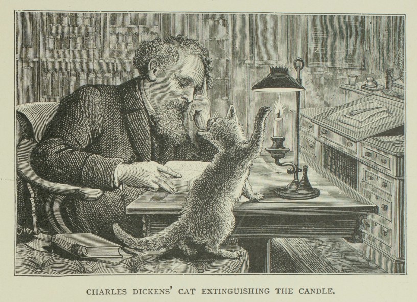 On account of our birds, cats were not allowed in the house; but from a friend in London I received a present of a white kitten — Williamina — and she and her numerous offspring had a happy home at “Gad’s Hill.” … As the kittens grow older they became more and more frolicsome, swarming up the curtains, playing about on the writing table and scampering behind the bookshelves. But they were never complained of and lived happily in the study until the time came for finding them other homes. One of these kittens was kept, who, as he was quite deaf, was left unnamed, and became known by servants as “the master’s cat,” because of his devotion to my father. He was always with him, and used to follow him about the garden like a dog, and sit with him while he wrote. One evening we were all, except father, going to a ball, and when we started, left “the master” and his cat in the drawing-room together. “The master” was reading at a small table, on which a lighted candle was placed. Suddenly the candle went out. My father, who was much interested in his book, relighted the candle, stroked the cat, who was looking at him pathetically he noticed, and continued his reading. A few minutes later, as the light became dim, he looked up just in time to see puss deliberately put out the candle with his paw, and then look appealingly towards him. This second and unmistakable hint was not disregarded, and puss was given the petting he craved. Father was full of this anecdote when all met at breakfast the next morning.