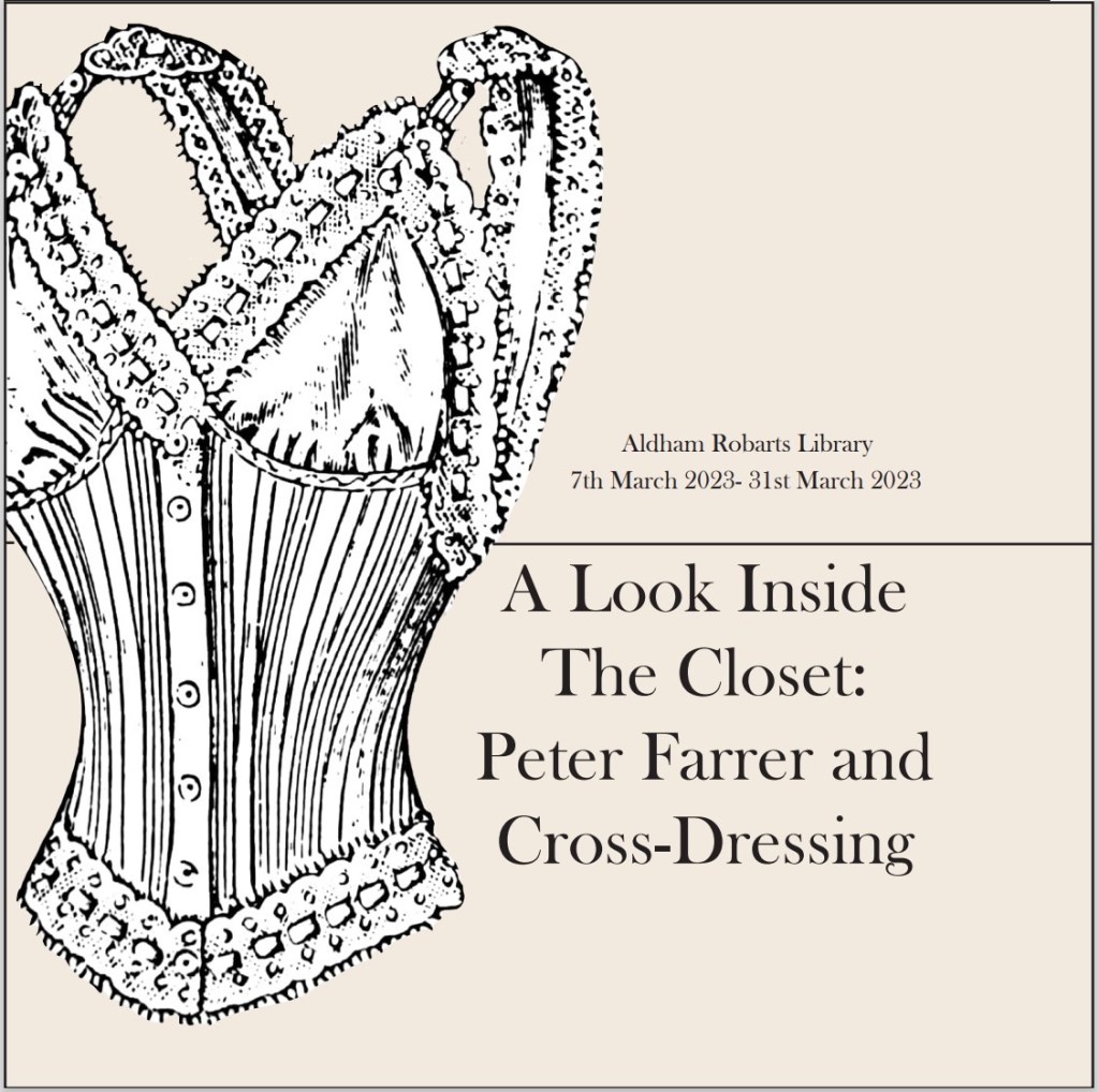 A new exhibition is now being hosted outside the Special Collections and Archives on the lower ground floor of the Aldham Robarts Library. A Look Inside the Closet: Peter Farrer and Cross-Dressing, produced by 3rd year History of Art and Museum Studies student Leah Bartlett as part of their Major Project which focuses on LGBTQ+ fashion. This exhibition displays material from the Peter Farrer archive that was given to LJMU Special Collections and Archives in 2017. This archive includes over 650 different items such as magazines, books, catalogues, short stories, newsletters, manuscripts and letters.