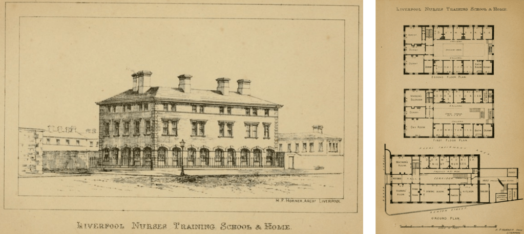 William Rathbone helped form the Liverpool Training School and Home for Nurses with Florence Nightingale in 1862. The School was attached to the Royal Liverpool Infirmary to provide thoroughly educated professional nurses to work in the infirmary, outside in the district, and for private families. Nightingale published her account of the Training School in 1865.