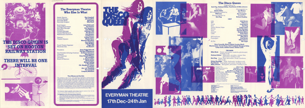 The Disco Queen, directed by Ken Campbell and starring Julie Brown, World Disco Champion, was an exuberant Christmas show staged as an alternative to pantomime. Campbell met Brown by chance on a train and asked her to choreograph and perform for the show. The dance movements of disco may have provided an escape from the climate of inner city economic uncertainty in Liverpool at that time, a chance to dress up, have fun and forget daily troubles. Use reference EVT/P/148 to access photos of The Disco Queen, EVT/PG/106 for the programme, and EVT/POS/98 for the promotional poster.
