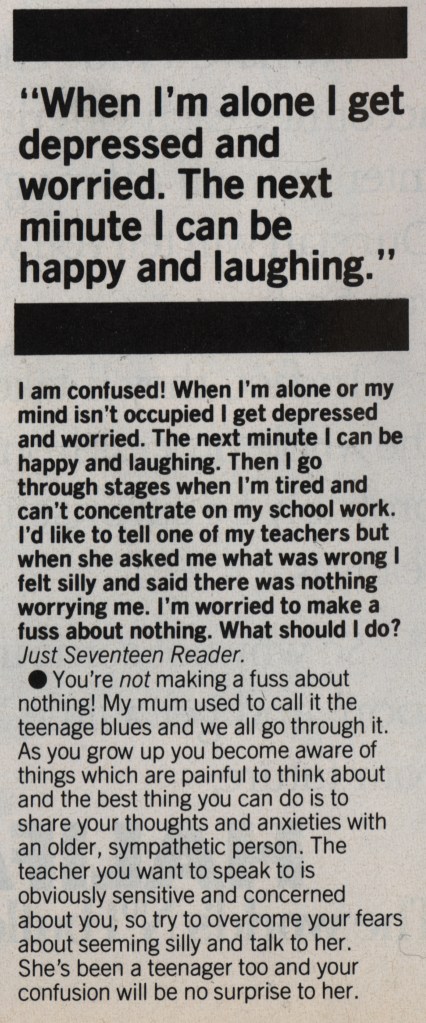 Jackie and Just Seventeen may have helped young people of the 1970s-1990s navigate their feelings and promote self-regulation through validating readers’ emotions in addition to helping re-direct intense feelings in a healthy way.