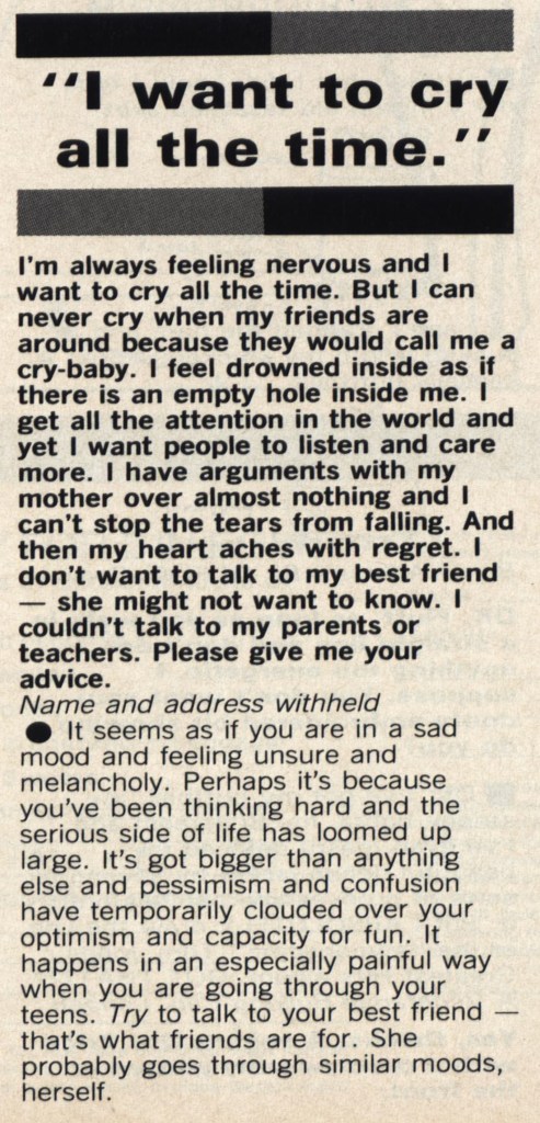 Editors also regularly responded directly to submissions from readers in their advice columns. Although they were generally supportive towards readers’ mental health, it’s important to remember that the editors always have the final word in these articles and it can be difficult to determine the actual impact of any article or given piece of advice. At the very least, these magazines were another space where teenagers could express themselves to a supportive adult anonymously.