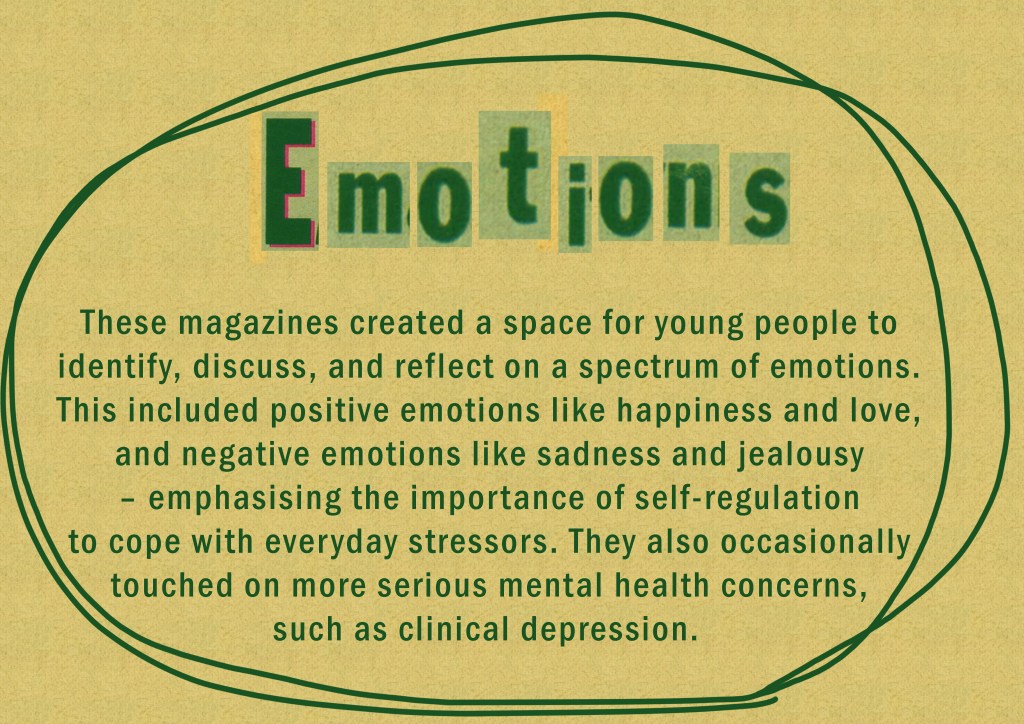 Emotions are described by the American Psychological Association as a conscious mental reaction towards subjective experiences accompanied by physiological or behavioural changes in the body. Simple yet profoundly impactful, the topic of ‘emotion’ is often less touched upon, with research lagging behind its significance. Surprisingly, popular magazines with teenage target audiences like Jackie and Just Seventeen addressed the importance of emotions in their later publications from the 1980s.