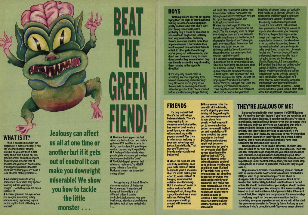 This green Hallowe’en edition of Jackie, published Oct 1990, featured the ‘green fiend’ as a manifestation of jealousy and how to manage it. This satirical interpretation may have helped users navigate their feeling without the guilt or embarrassment, and provided practical advice on how to ‘tackle’ it including having a conversation with the people you feel jealous of or about, and reframing jealousy as a tool for self-improvement.