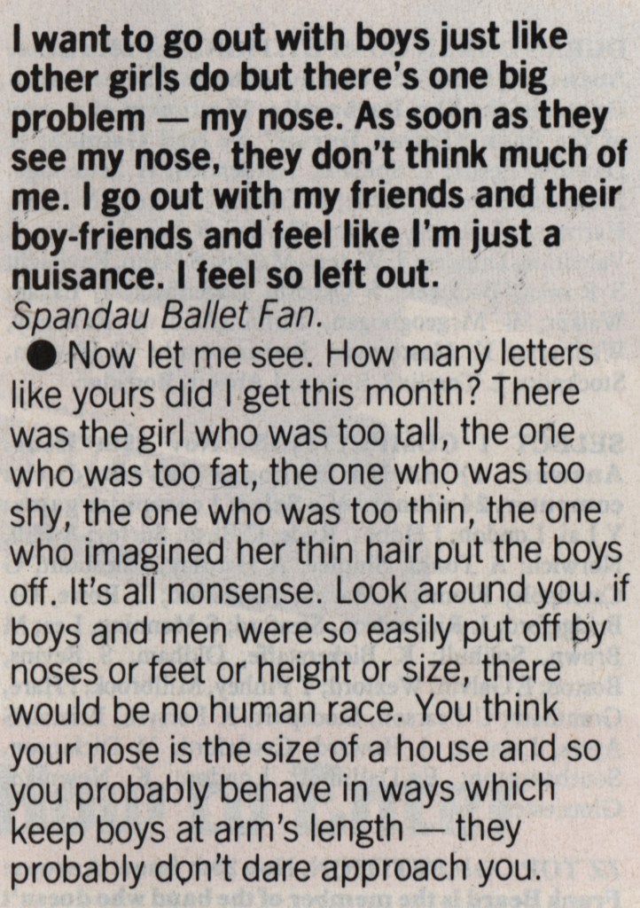 Many girls expressed worry over how they aren’t skinny enough, or a want to change a specific body part. Sometimes this stems from a need for social and romantic connections, and being scared that if one does not fit in set beauty standards, one might not be accepted in the social group. In this response, the editor explained that we all have different body types and that is okay – what matters is our personality and behaviour.