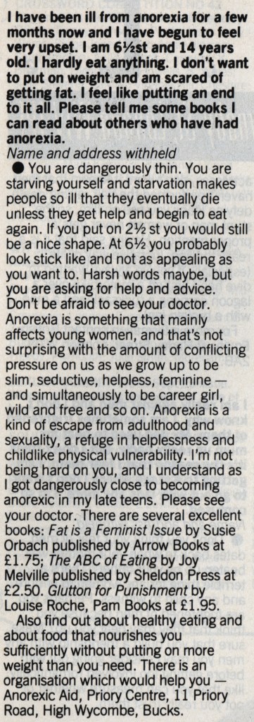 Towards the end of the 1970s and in the 1980s, Jackie and Just Seventeen began publishing more articles to raise awareness about the growing risks of anorexia, an eating disorder, and signposting professional bodies who may have been able to help readers.