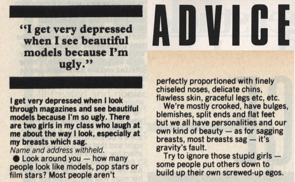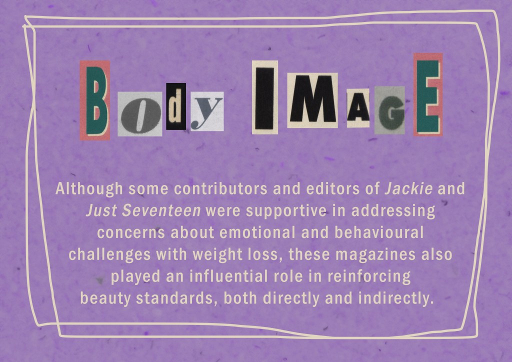 Jackie and Just Seventeen of the 1970s and 1980s played a role in upholding and reinforcing beauty standards, as well as to encourage body acceptance. The differing opinions offered within each magazine evidences the changing and conflicting attitudes held by popular culture at that time, as both a social reflector, influencer, and reinforcer. Body image concerns were common then as they continue to be today.
