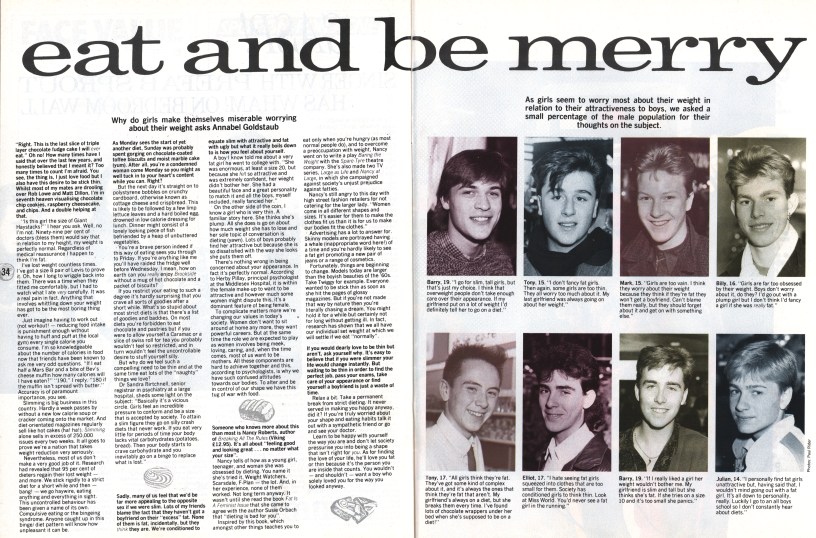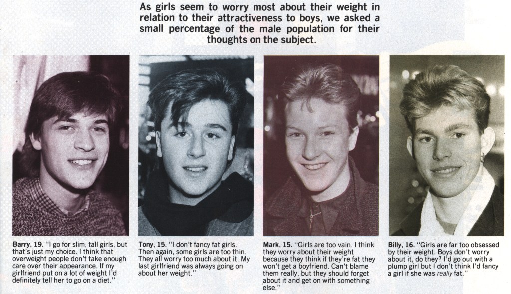 These conflicting attitudes were even present within single articles. ‘Eat and Be Merry’ discusses why ‘girls make themselves miserable worrying about their weight,’ to fit into societal beauty standards. Although the author encourages readers to recognise their worth is not dependant on their size, this advice is contradicted by the profiles of teenage boys with their opinion on weight in relation to attractiveness in girls within the same double-page spread, with no critique or response offered by the editors.