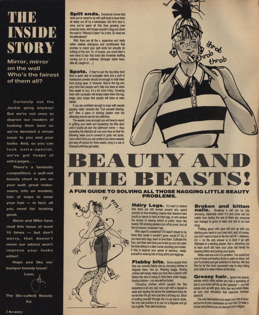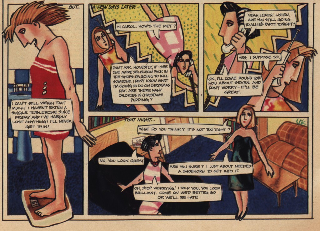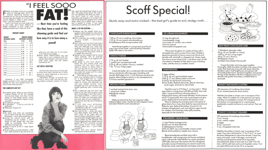 Another example suggests that next time you ‘feel sooo fat!’ you should ‘have a read of this slimming guide and find out how easy it is to lose many a pound!’ alongside a suggested weight chart was only a few pages away from the ‘Scoff Special!’ guide to make recipes such as chocolate cake, ice cream doughnuts, and choccy fudge.