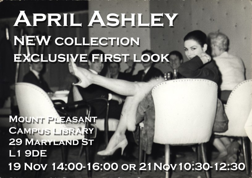 LJMU Special Collections & Archives are delighted to announce our recent acquisition of April Ashley’s Personal Papers, and we want to hear from our community to learn more about: what you want to see more of; what you want to happen next; and how we can work with you in the future.